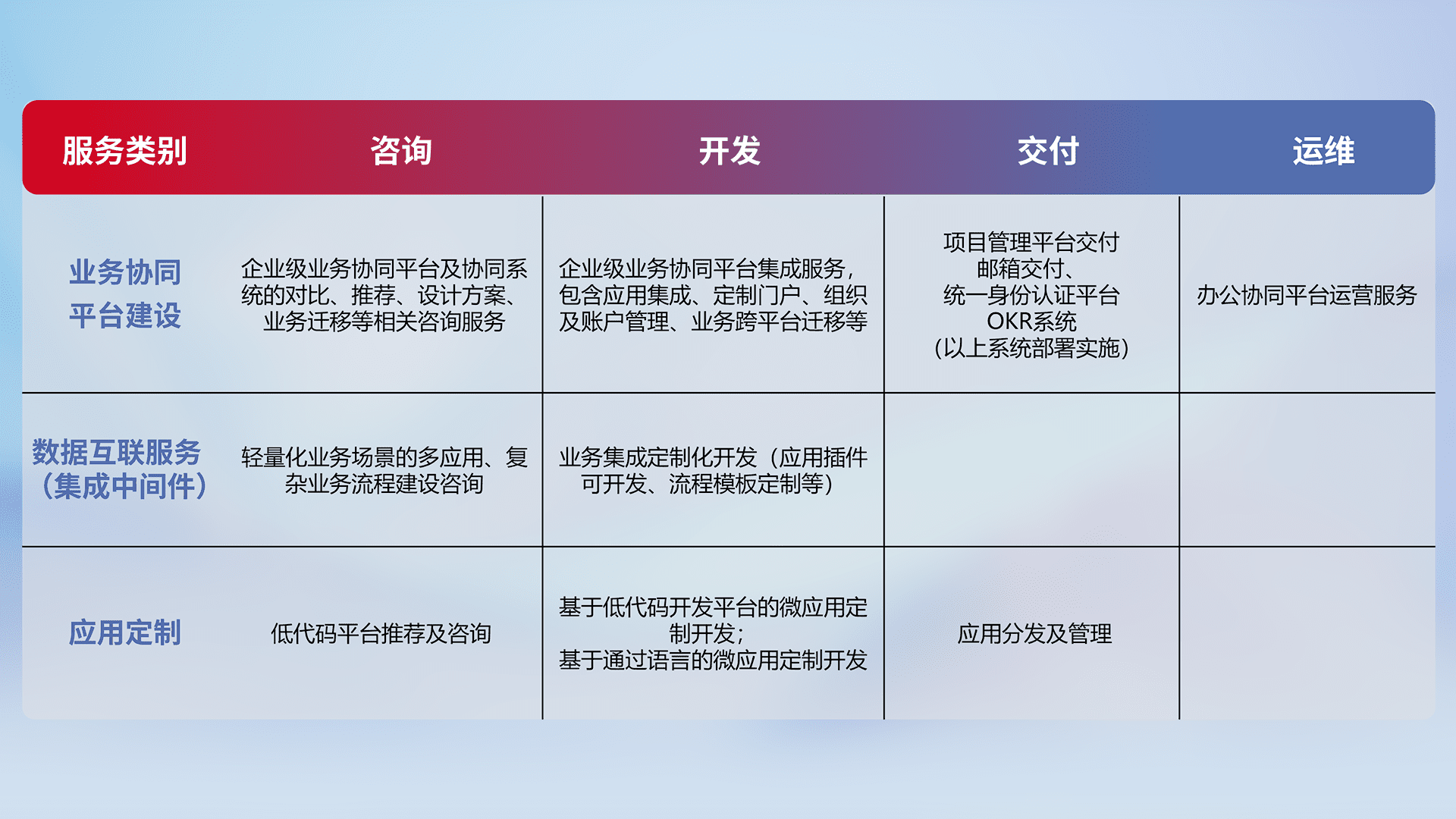 针对钉钉、、、、企微、、、、IDaas等平台级产品提供产品的规划、、、方案、、、、交付、、定制化开发等服务,,实现如统一协同办公、、、智能客户服务、、、混合会议管理、、、智能数据查询、、、、等业务场景,,实现数字化转型。。